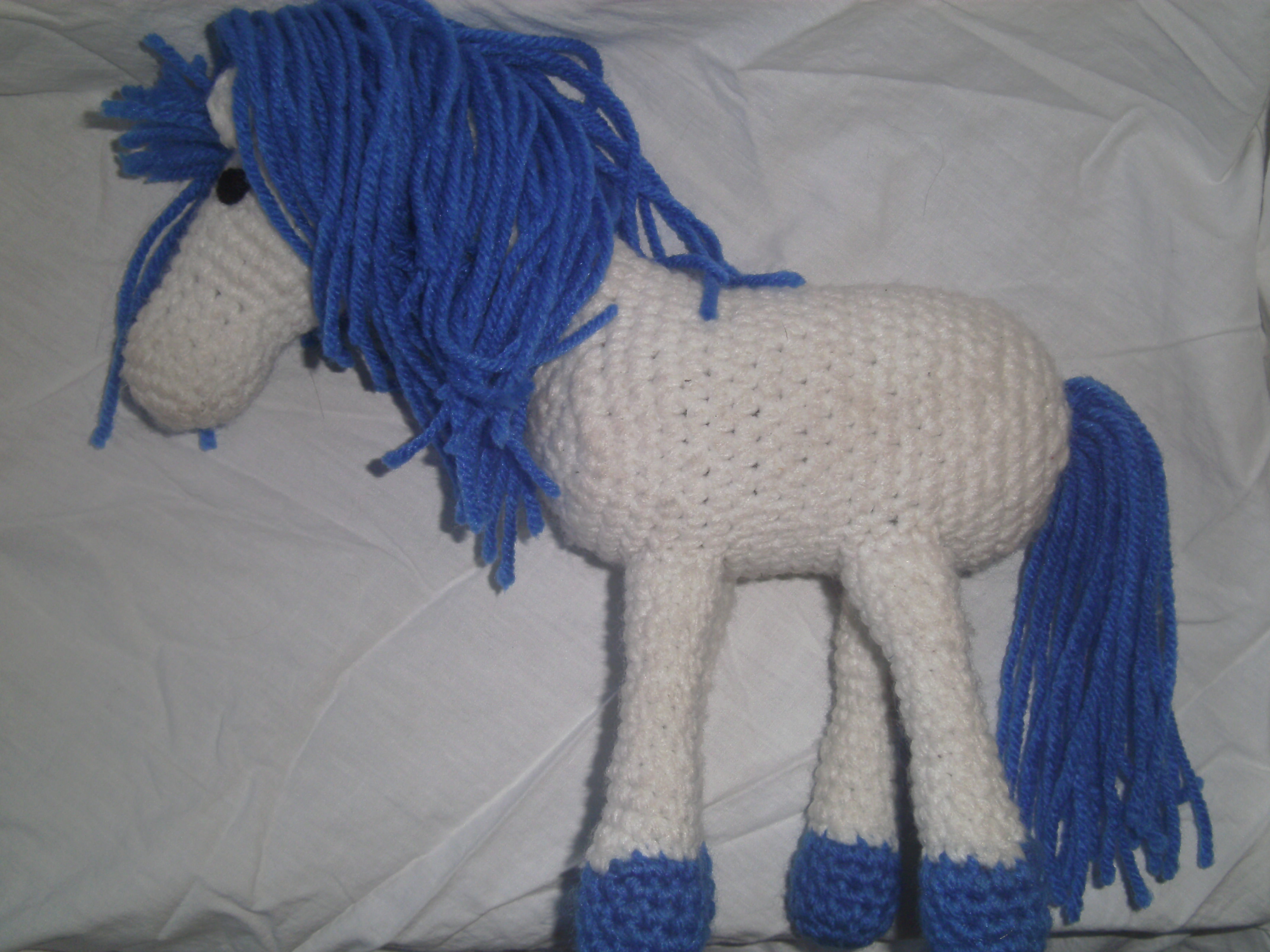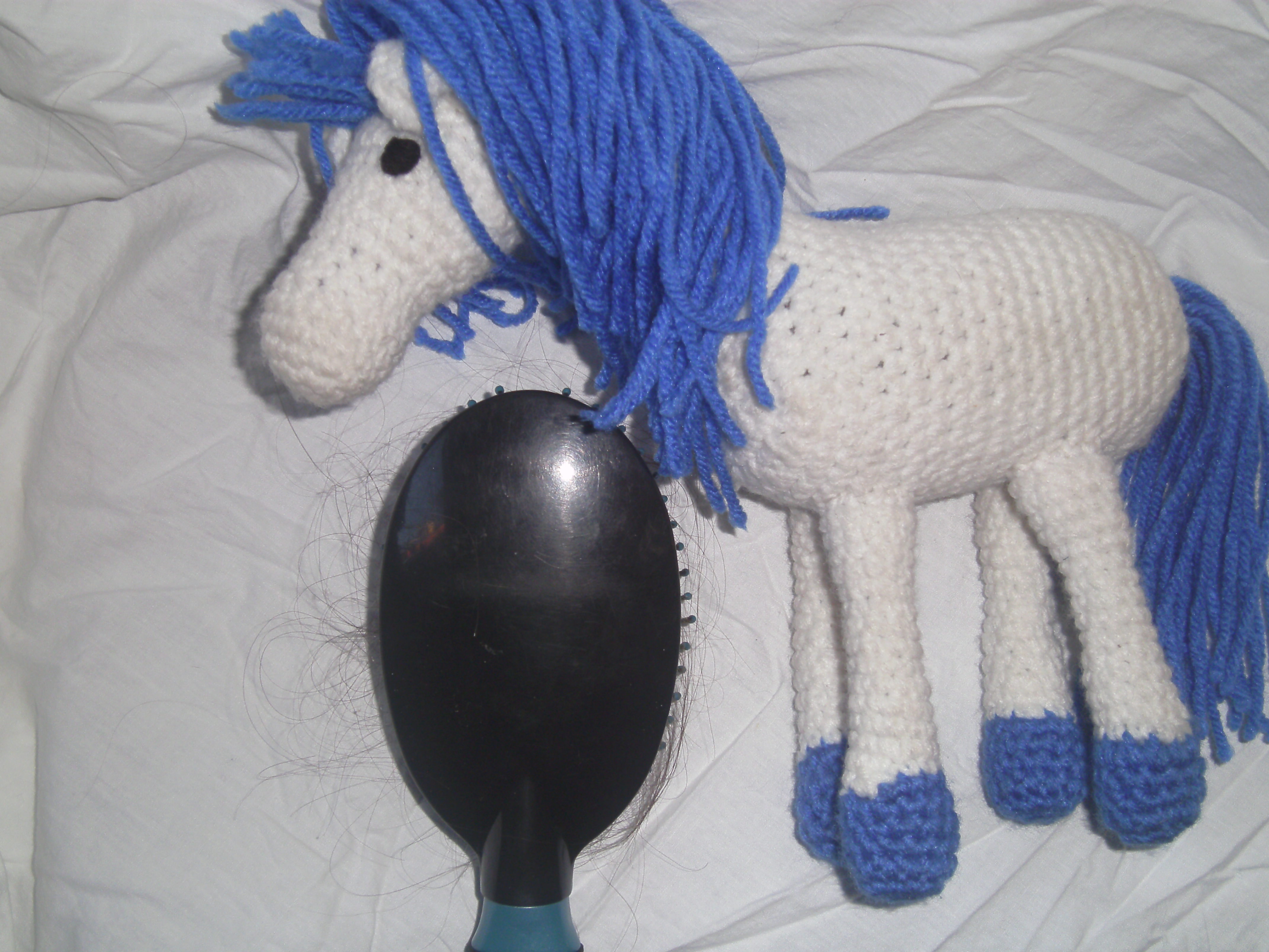 This horse can be made in any colors to make it special for your special one. A great custom gift for any child. Hours of fun for any child, my 6 and 4 year old play with it all the time. Made from red heart super saver yarn, stuffed with yarn scraps. Stands on its own about the size of a regular hair brush