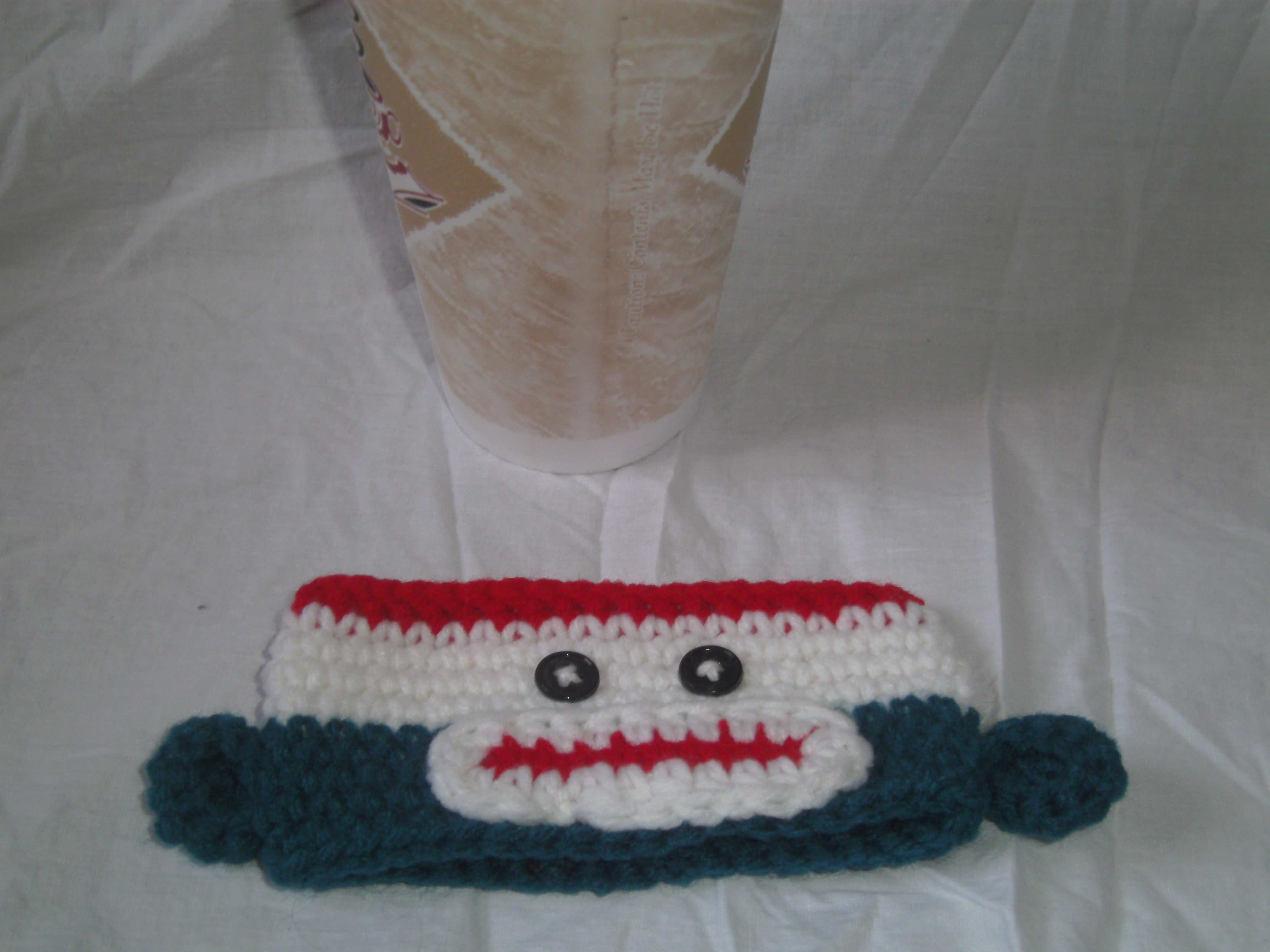 This Teal sock monkey cup cozie great for hot or cold drinks. Add a little whimsy to your morning coffee either at home or from the coffee shop or your favorite hot or cold drink. A great gift for the monkey in your life.